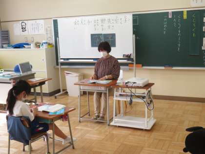 10/22 2時間目1年生国語の学習 公開日 2024/10/22 更新日 2024/10/22 できごと 1年生の国語は物語文「くじらぐも」の学習に入っています。今日は1の場面について読み進めていました。