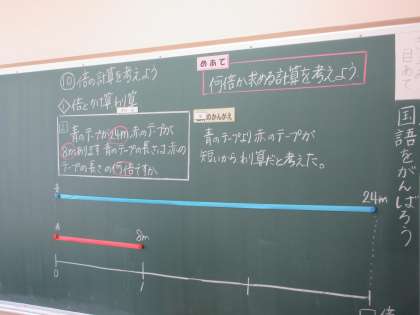 10/22 4校時みかぼ学級算数の学習 公開日 2024/10/22 更新日 2024/10/22 できごと みかぼ学級では5年生が算数の「倍とわり算」の学習をしています。○○の何倍になるでしょうか、との問いに対して「わり算で考える」と答えていました。この後、なぜわり算で考えるのかを図などを使いながら考えを深めていきます。