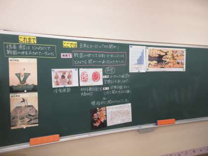 10/22 4校時6年生社会科の学習 公開日 2024/10/22 更新日 2024/10/22 できごと 6年生は社会科で「戦国時代とキリスト教との関係」について学習しています。様々な資料が提示されそれらを元に、「西洋の風習や習慣を積極的に取り入れた」「キリスト教そのもの考え方が受け入れられた」など考えを出し合っていました。この後鉄砲との関わりなども関連させて考えを深めていきます。