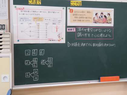 10/23 3校時6年生算数の学習 公開日 2024/10/23 更新日 2024/10/23 できごと 6年生は算数で「樹形図」を用いた学習をしています。「何パターン」あるかなど普段の生活のかなでもよく耳にしており、順序立ててやることで取り組みやすいところでもあるので、子どもたちも進んで取り組んでいました。