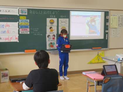 11/1 3時間目5年生外国語の学習 公開日 2024/11/01 更新日 2024/11/01 できごと 5年生の外国語の学習は「身近な人を紹介しよう」を単元のゴールとして学習しています。今までの学習では自分の紹介する人を決め、インタビューをして、聞いたことを英語表現にして、スライドでまとめてきました。今日は最後の発表の日でした。みんな自分の作ったスライドを利用しながら堂々と発表することができました。