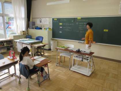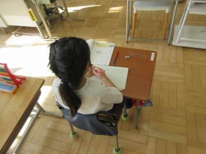 1年生は引き続き算数の足し算の学習に取り組んでいます。「8+3」のように繰り上がり鵜のある足し算で、「10のかたまりをつくるとわかりやすい」ことを学んでいたので、それをもとに考えています。