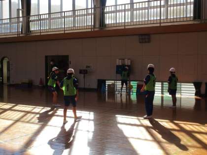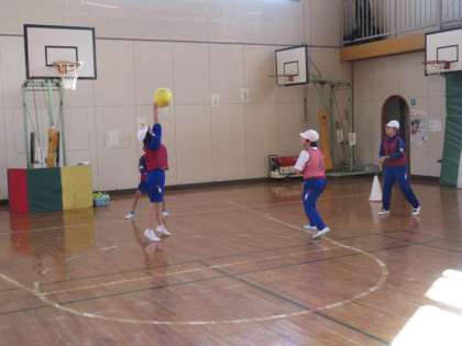 456年生の子どもたちは体育館で体育の学習です。今日はボール運動でソフトバレーボールに挑戦です。ふだんから休み時間や放課後みんなでトス回しをしている成果があって、スムーズに取り組んでいます。先生からは声を掛け合うなどのアドバイスを受けていました。この後実際にゲームをして楽しむ予定です。