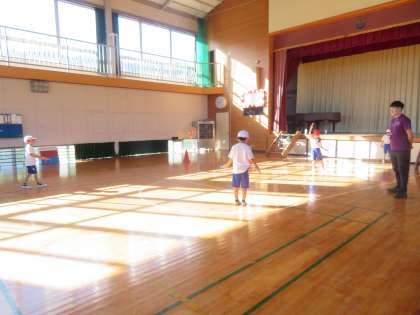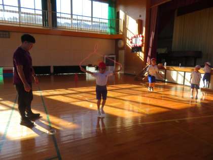 今日の低学年の体育は体育館で行いました。縄跳びのチャレンジしていました。後ろ回しが上手にできていました。