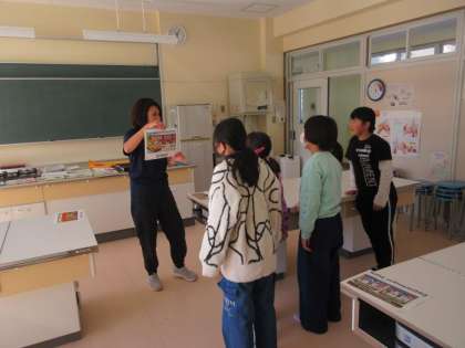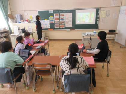 毎週金曜日はALTの先生、英語専科の先生が来校し英語の授業をしています。5年生は道案内を英語でする学習に取り組んでいます。映像を使ったレクチャーを受けた後、家庭科室のテーブルを待ちに見立てて、行ってみたい場所のカードをそれぞれのテーブルに置き、まずはALTの先生に英語で場所を尋ねます。ALTの先生が見本として「ゴーストレイト ワンブロック」など道を案内して実際にそこに行けるかを確認していました。この後子どもたちが道案内を英語でします。子どもたちが戸惑うことなく英語を受け入れているのは普段の学習の成果です。