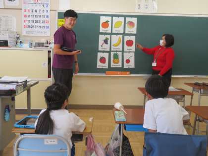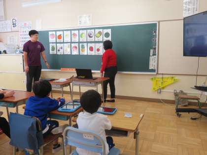 11/8 5時間目低学年外国語活 公開日 2024/11/08 更新日 2024/11/08 できごと 今日は低学年の外国語活動がありました。ALTの先生と一緒に果物を表す英語を言ったり、ゲームをしたりしました。みんな楽しく活動していました。