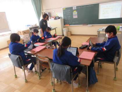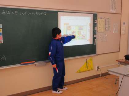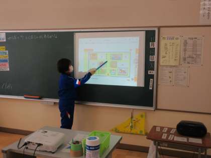 11/12 2校時5年生英語の学習 公開日 2024/11/12 更新日 2024/11/12 できごと 毎週火曜日は美土里小から英語専科の先生が来校し英語を教えてくれます。2校時は5年生の教室で、「道案内」を英語で行うための学習をしていました。タブレットの音声を元に、黒板に映し出された地図をたどることで、どのように英語で説明しているかをとらえていました。