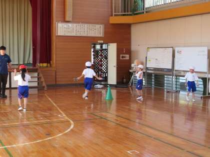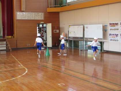 1・2年生は体育館で体育の学習です。縄飛びの学習が始まりました。カードのめあてをもとに、みんな張り切っています。たくさん跳べたことを先生にほめられてうれしそうです。