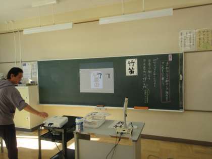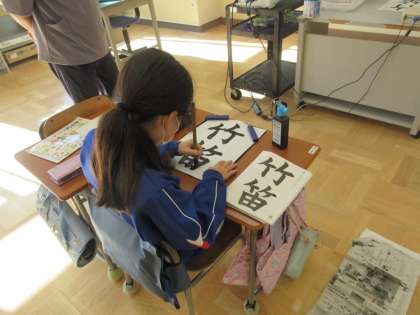2年生は毛筆で「竹笛」という字を練習しています。「笛」の「田」のくにづくりの縦書きの部分を斜めに書いていることをタブレットで確認して練習しています。毛筆でもタブレットが便利に活用されています。