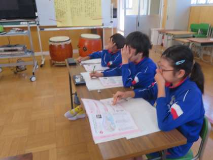 11/14 2時間目高学年音楽の学習 公開日 2024/11/14 更新日 2024/11/14 できごと 今日の高学年の音楽は鑑賞の学習をしていました。「言葉と旋律の美しさを感じ取りながら、日本の歌を味わおう」をめあてに、滝廉太郎作曲の「花」の鑑賞をしていました。