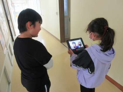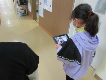 11/15 3校時5年生英語の学習2 公開日 2024/11/15 更新日 2024/11/15 できごと 実際に道案内が始まりました。校舎内でタブレットをmeetでつないで英語で指示しながら実際にその場所にたどり着けるか挑戦しています。