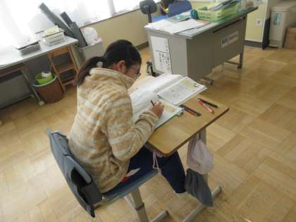 11/19 2校時6年生算数の学習 公開日 2024/11/19 更新日 2024/11/19 できごと 6年生は算数の「比」の学習を進めています。今日は比の割合から実数を求める問題に取り組んでいます。150mlのドレッシングの酢とサラダ油の比が2:3の時の酢の量を求めようとしています。問題文だけでは難しいのでつなぎ教材として、数直線がつかわれています。数直線から全体が「5」であることがわかり、150mlを5等分して考えることに気付くことができました。