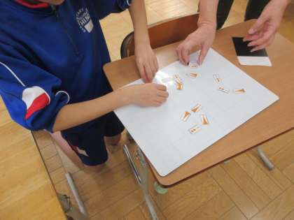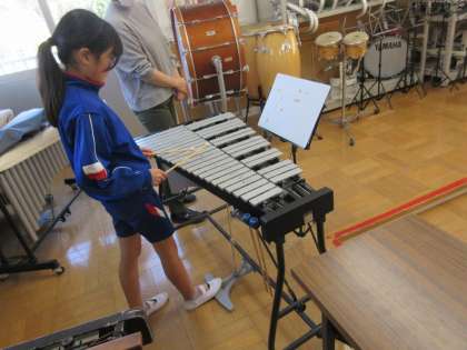 4年生は先生といっしょに打楽器を使ったリズム打ちでの創作活動に取り組んでいます。ウッドブロックや鉄琴を、強弱をつけたり音程を変えたりしながら組み合わせを試しています。鉄琴もちゃんと自分の好みでバチの素材を選んだりと、自分なりに工夫を加えながら創作活動を楽しんでいます。