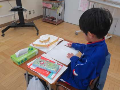 2年生の国語は「おもちゃの作り方をせつめいしよう」の学習に取り組んでいます。今日は教科書の文章を参考に、自分のつくったおもちゃの作り方の説明を文章で書いていました。
