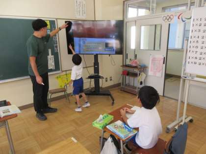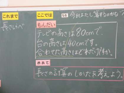 11/22 3校時2年生算数の学習 公開日 2024/11/22 更新日 2024/11/22 できごと 2年生は前回に引き続きセンチメートルとメートルの関係について学習しています。今日はテレビとテレビ台を合わせた高さを表すのに式を立てて答えを出しています。2人ともセンチメートルで表していますが、先生から「他の表し方があるかな」の問いかけに「メートルをつかう」と答えています。160センチメートルを1メートル60センチメートルと表すことができています。