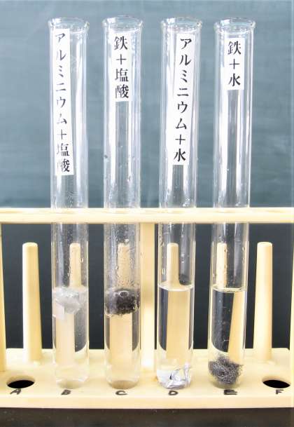 1/22 6年生理科 その4 公開日 2025/01/22 更新日 2025/01/22 できごと 金属にうすい塩酸を注ぐとどうなるか、調べました。アルミニウムや鉄を水に入れても変化が見られませんでした。塩酸には、アルミニウムや鉄などの金属をとかすはたらきがあることがわかりました。