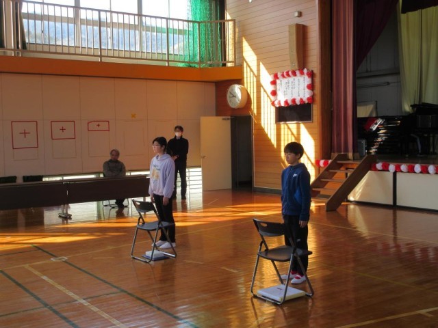 今日の1校時は、卒業式の予行練習を行いました。会場の引き締まった雰囲気に、参加した1年生から6年生の児童も引き締まって見えました。一通り実施してみて、細かい点を微修正した後、在校生は別れの言葉の最後の練習を行いました。「言葉に気持ちをのせる」ことを指導された在校生は、縦割り班で集まって、どんなところに気を付けるか確認した後、感情をこめはっきりとした言葉で別れの言葉を述べることができ、先生からほめられていました。週明け月曜日が卒業式です。去りゆく卒業生が思い出に残るような卒業式となるよう子どもたちはがんばります。