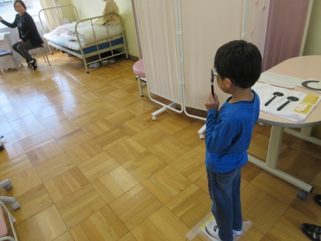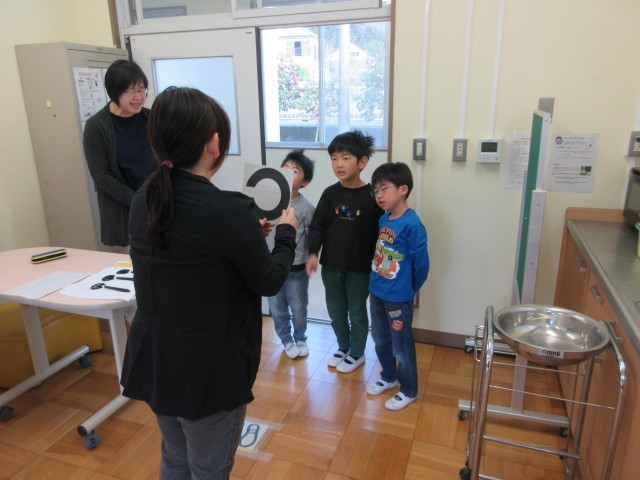 今朝の業前は視力検査を行いました。養護の先生から説明を聞いて視力を検査します。説明をよく聞いて整然と検査を受けています。