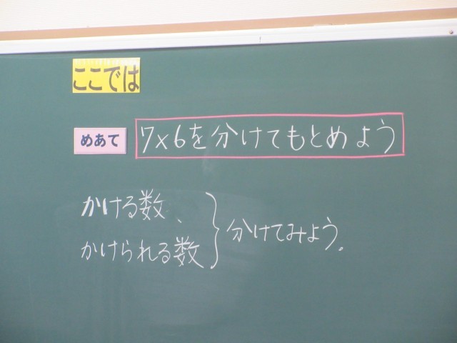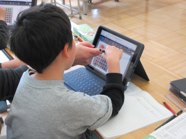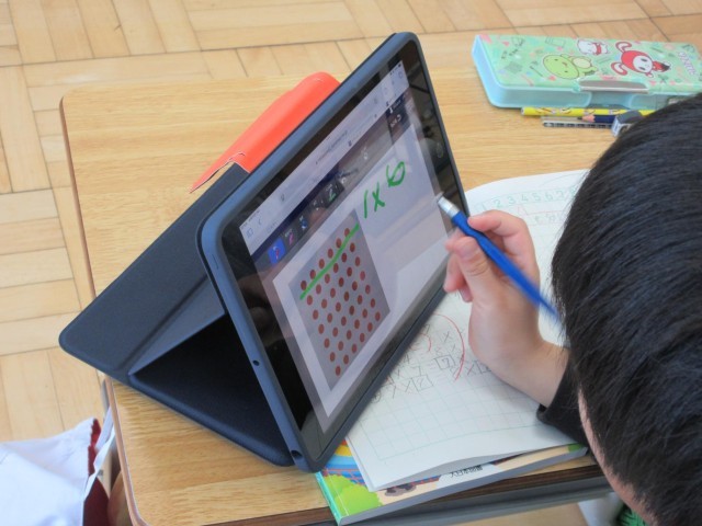 3年生はタブレットをつかって、かけ算の学習をしています。タッチペンをつかってタブレット上の「7×6」を○で表した図を様々に分けてみて、式の表す意味を捉えようとしています。この後それぞれの分け方を、アプリで集約して互いの考えを共有します。