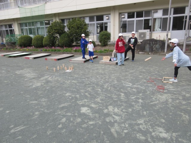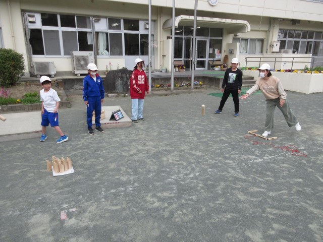 今日の昼休みは、図書の貸出(返却)の後、サッカーをする子がいたり、モルックをする子がいたりと思い思いに過ごしています。モルックは、日野地区の地域学校協働活動コーディネーターの方が貸してくれました。ルールもすぐ覚え、楽しんでいます。