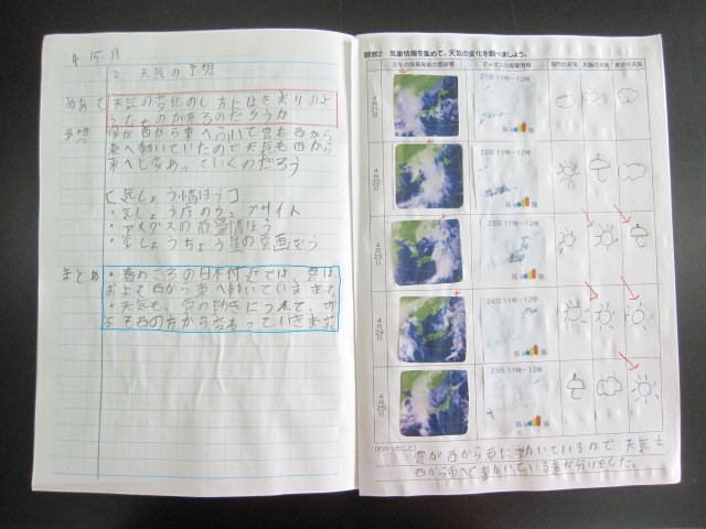 4/14 5年生 理科 公開日 2025/04/14 更新日 2025/04/14 できごと 気象情報を集めて、天気の変化を調べました。 春のころの日本付近では、雲は、およそ西から東へ動いていくので、天気も、雲の動きにつれて、およそ西の方から変わっていくことがわかりました。 +1