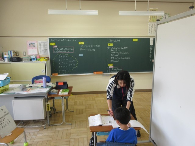 みかぼ学級では算数を学習中です。5年生は立体図形の学習です。直方体や立方体のつくりについて、面の形や数に着目して、実際の図形を元に確かめていました。2年生はたしざんの筆算のしかたを考えるのに、1けたのたしざんで位が上がる計算について何度も確かめていました。「これまで」「ここでは」「この後は」の流れで学習が進みます。
