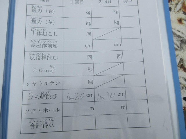 12年生は、新体力テストに挑戦中です。今日は50m走の記録を取りました。先生から「腕をしっかりふって走るんだよ」と声をかけられ、みんな一生懸命走っていました。この後ボール投げや、立ち幅跳びを行っていきます。それぞれの記録を、自分の表に書き込んで、自分の今の記録や次の目標を口々に言っていました。