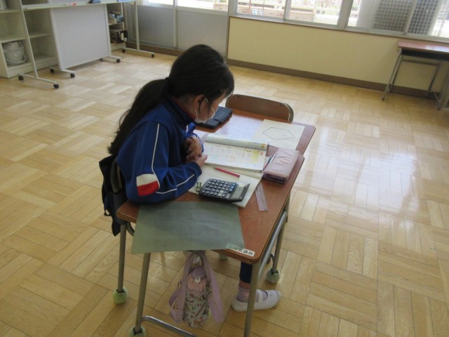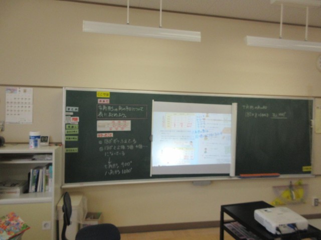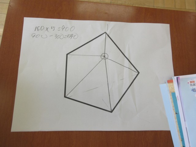 5年生は算数で多角形の角の和を求めるについて考えています。前時に考えた「三角形の角の和」をつかって、角が増えるごとに角の和がいくつずつ増えるのかたしかめています。これまでに学んだことをいかしながらの学習が続きます。