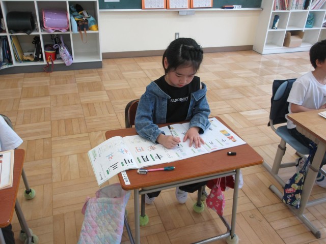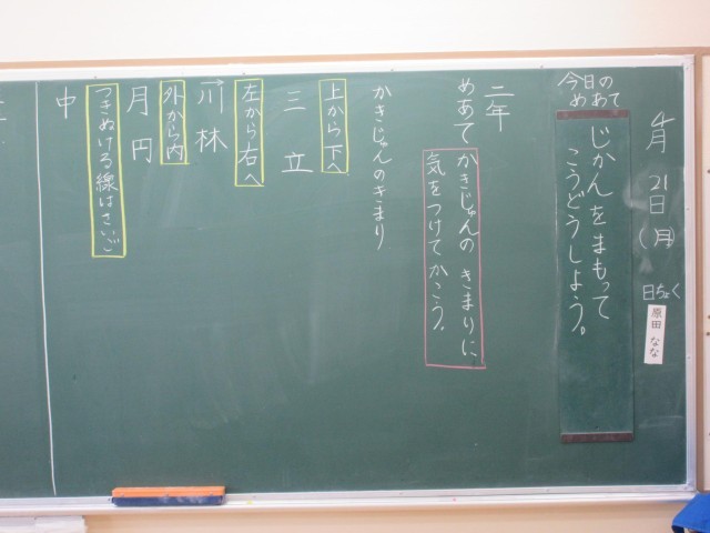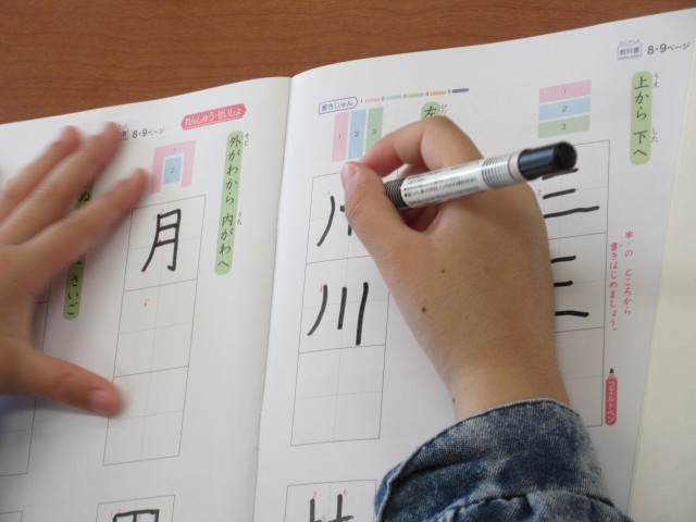 2年生は3年生と一緒に書写の学習をしています。今日は書き順のきまりに気を付けて漢字を書く練習をしています。フェルトペンをつかって集中して慎重に練習しています。学年が1つ上がり、学習態度もよりしっかりしてきました。