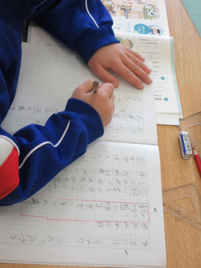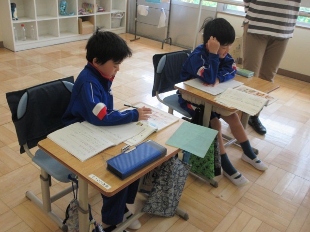 3年生は、言葉の学習で「主語」と「述語」について学習しています。教科書の挿絵から、主語と述語のみをつかって文章を作ろうとしています。先生と3人でああでもないこうでもないと意見をいいながら、楽しそうに学習しています。