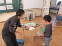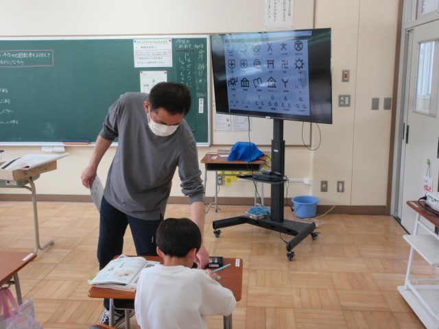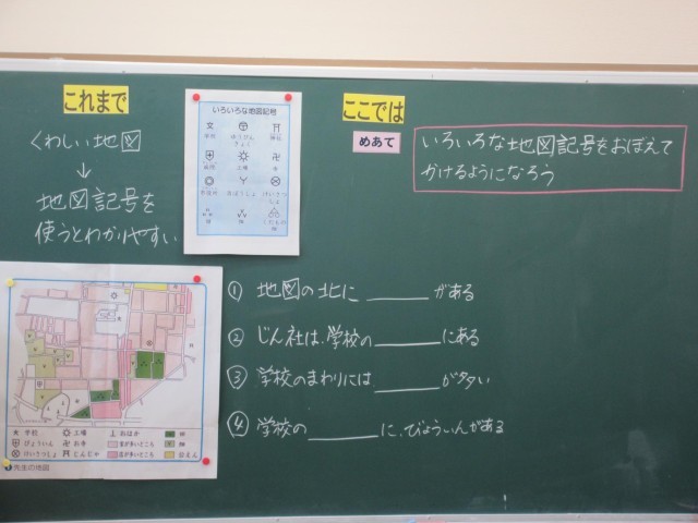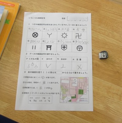 3年生の社会科は地図記号の学習です。おもな地図記号や東西南北について確認した後、プリントをつかってたしかめています。