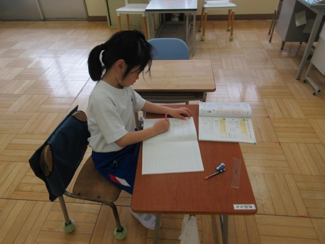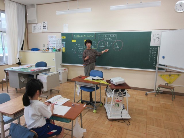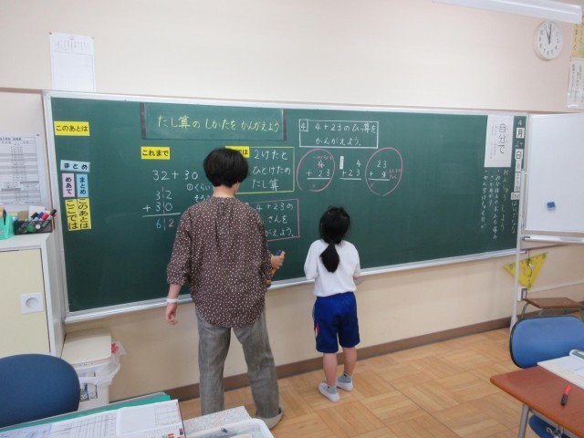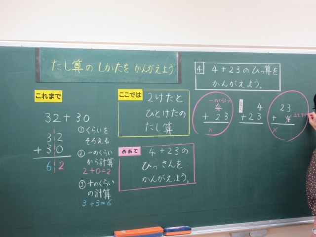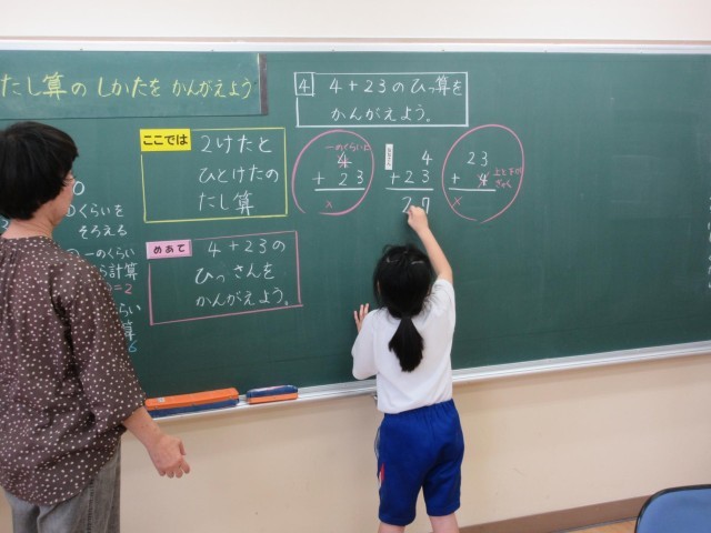 2年生は算数でひっ算の学習をしています。「4+23」のように、一けた+二けたの筆算をするのに、先生からわざと位が揃っていなかったり、足す数と足される数を逆にしたりと、間違ったひっ算を例示し、どのやり方が正しいかを選ばせていました。2年生は、位が揃っていないことや順番が逆になっていることをちゃんと理解し、正しいひっ算で計算することができました。先生からほめられてとても得意そうでした。