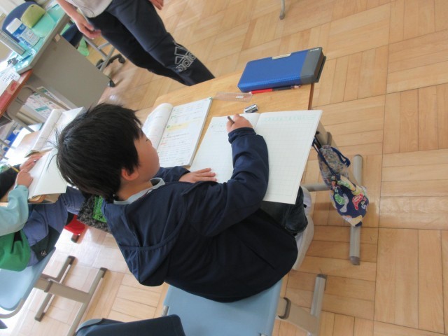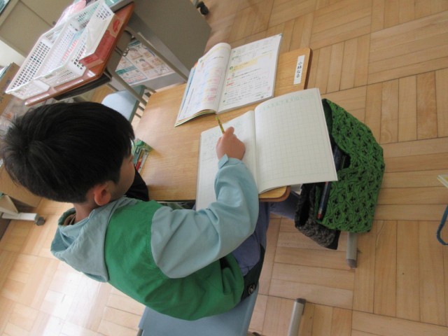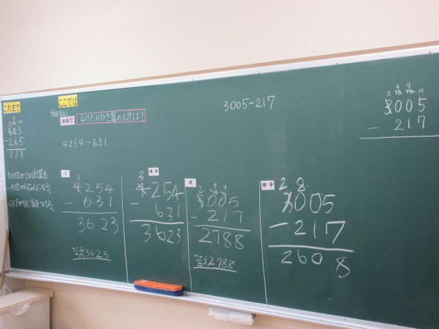 3年生は算数で大きな数の筆算に取り組んでいます。今日は4けたの数の引き算です。数の仕組みを理解して、繰り下がりの計算をしています。特に3005-217のように繰り下がりがある計算では、じっくり取り組んで答えを出していました。