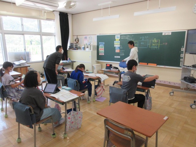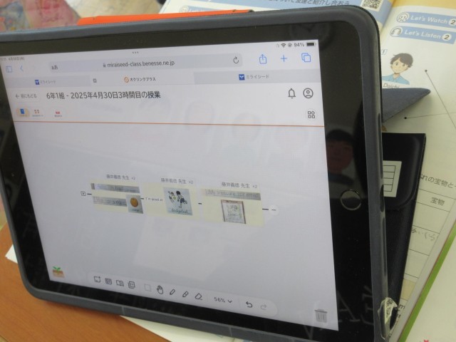 6年生はALTの先生といっしょに英語の学習をしています。今日はオクリンク+をつかって、自分の自己紹介をする準備をしています。先生が用意してくれたフォーマットに、好きなものや宝物、イラストなどを入れ込み、互いに交換しあっています。これを英語で発表する練習をこれからしていきます。