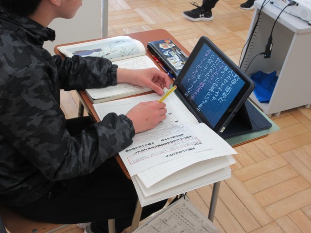みかぼ学級では6年生が「大造じいさんとガン」の読み取り、3年生が「春がいっぱい」の言葉あつめを行っています。6年生は、たくさんの文字をノートに書き写す際に、タブレットで撮影して拡大するなど、工夫して丁寧に書き写しています。また2年生は、「春がいっぱい」の文章をまずはノートに書き写していましたが、「上手に書けるようになったね」と先生にほめられていました。