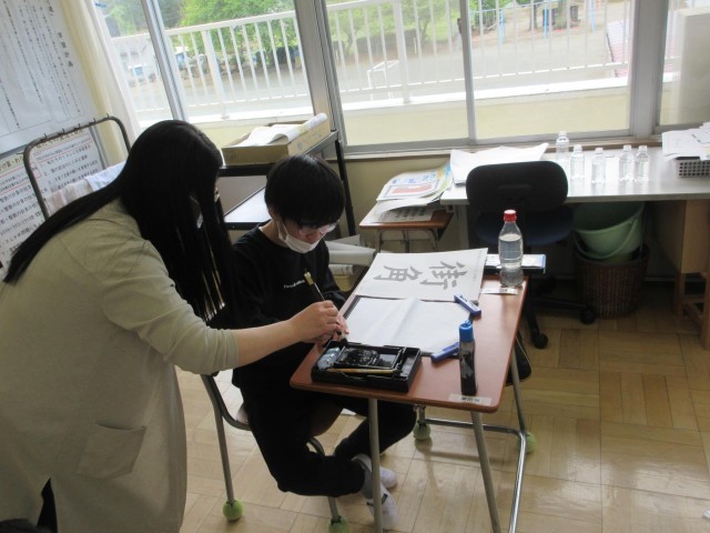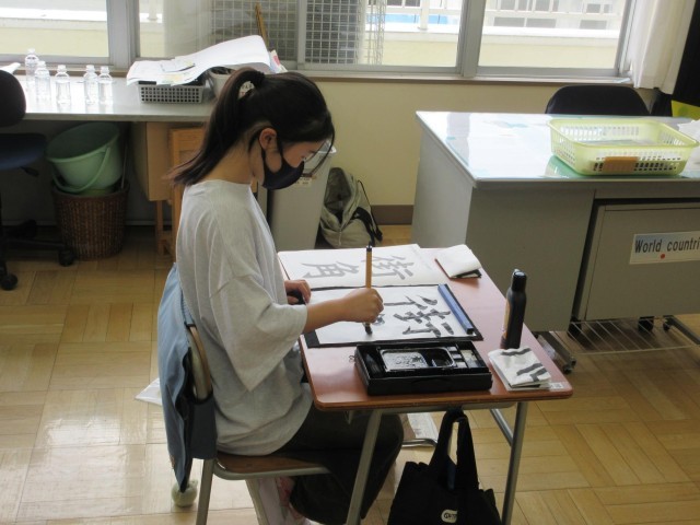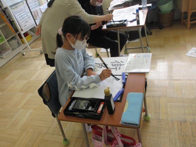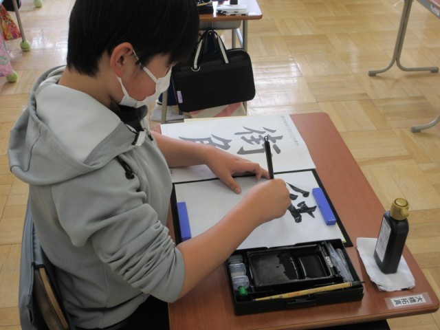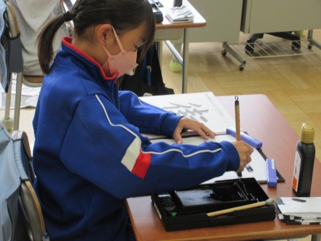 6年生は、「これまで」学習した「湖」の字で気を付けることをもとに、「街角」の「街」という字の毛筆の練習に取り組んでいます。一人一人がとても集中しているのでしんと静まりかえった教室で、一心に筆を滑らせていました。