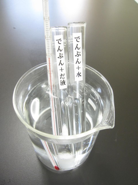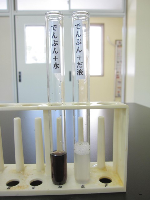 ヨウ素液を使って、でんぷんとだ液のはたらきの関係を調べました。
