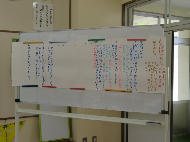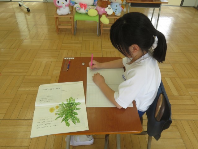 2年生は、説明文「たんぽぽのちえ」の学習をしていました。たんぽぽが「いつ、どんな知恵を使うのか」を文章から読み取り、まとめていました。身近な花であるたんぽぽの不思議に驚かされました。