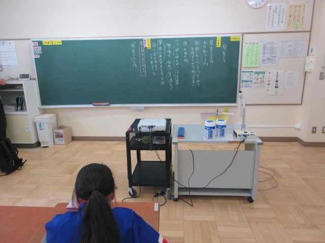 5年生は国語で「見立てる」ことについて書かれた説明文の要旨をまとめる学習に取り組んでいます。まずはどんなことが書いてあるのか、これまでの学習の確認も含め、CDの朗読を聞きて全体の構成がこれまで学習したものと合っているかどうかたしかめていました。