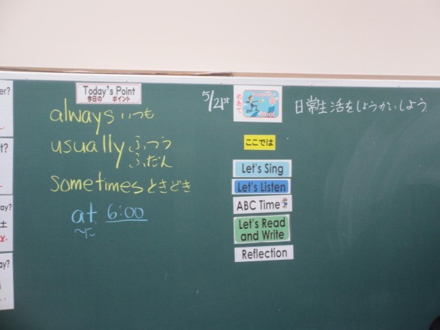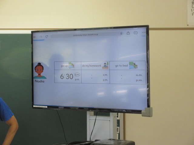 今日は週に1回のALTの先生が来てくれる日です。6年生はブラント先生に「一日のスケジュールを英語で伝える」学習に取り組んでいます。「get up」「do my homework」「go to bed」の3種類について、それぞれ時刻を記入し確認した上で、英語で話す練習をします。テンポよく学習が進んでいます。