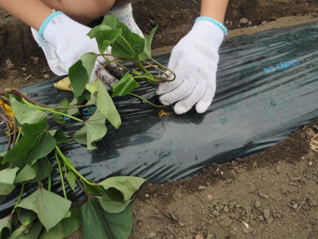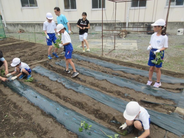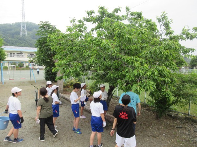 今日の業前は、学校園に、サツマイモの苗を植えました。団ごとに分かれて植えましたが、6年生がよく2・3年生に指示してテキパキと植えていました。日野小学校のよさである「上級生が下級生の面倒をよくみる」が、ここでも発揮されていました。サツマイモは秋の学校公開日に焼き芋にしてみんなで食べる予定です。終わって校舎に入るとき「さくらんぼ」のなり具合を見ていきました。どうも人より早く鳥が食べてしまっていたようです。