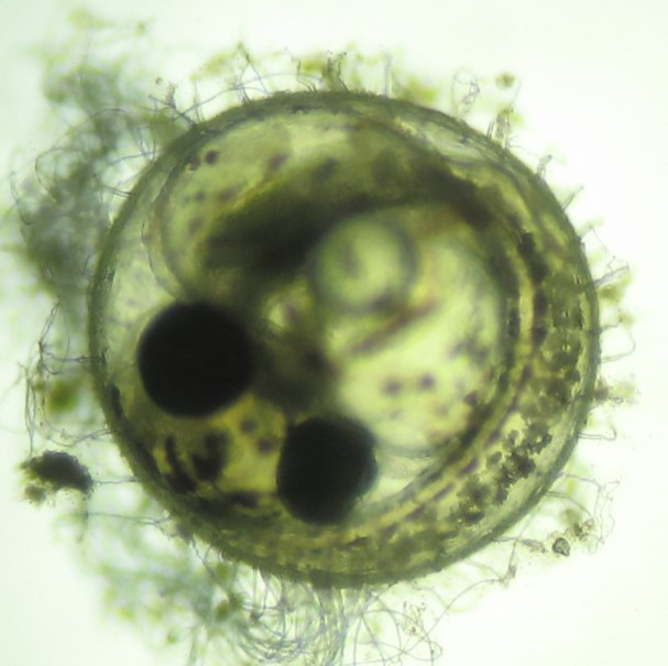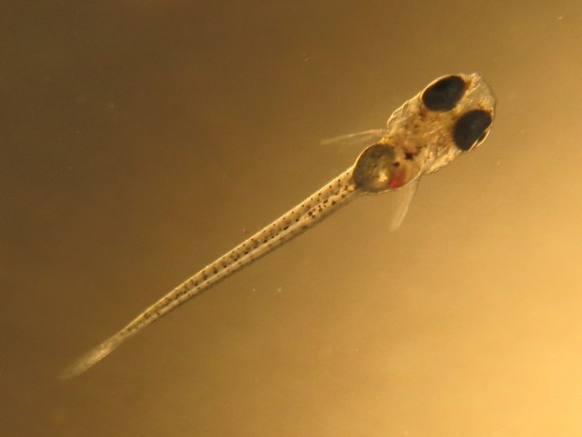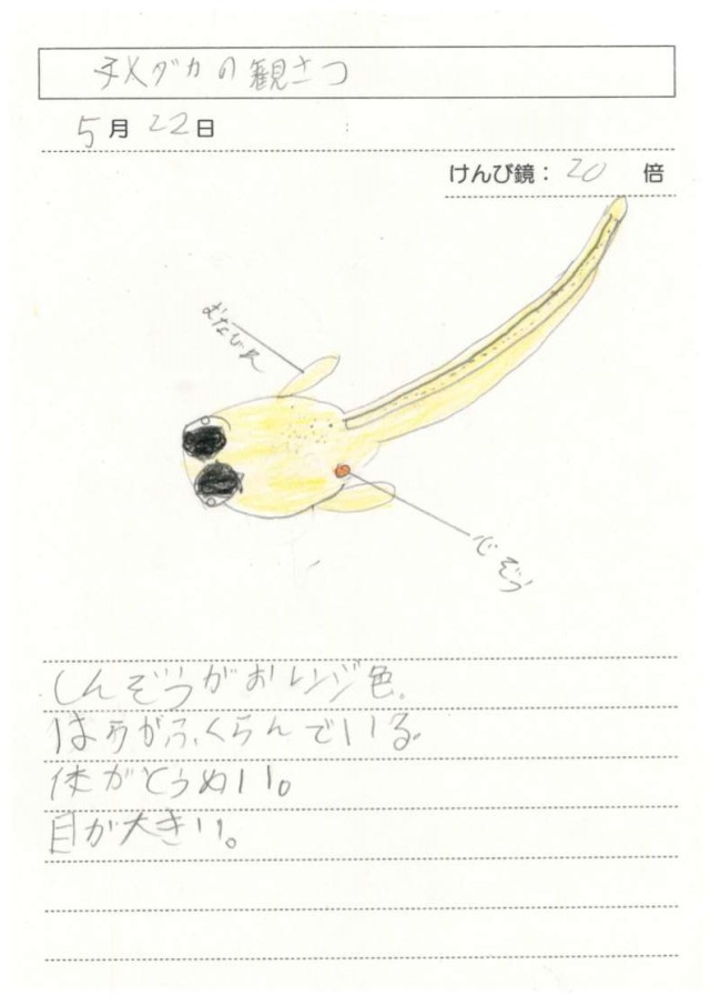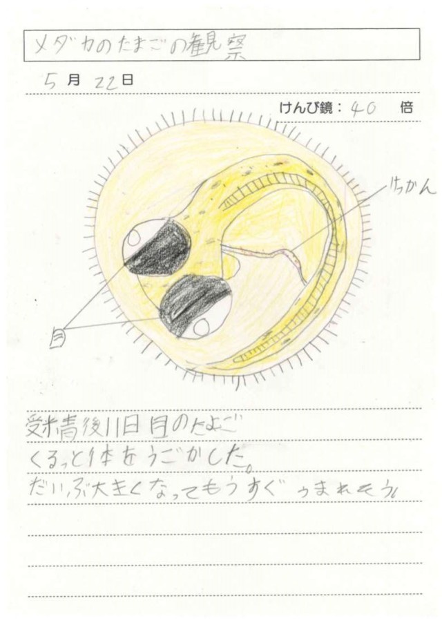 受精後11日目のふ化直前のたまごとふ化したての子メダカを観察しました。