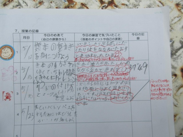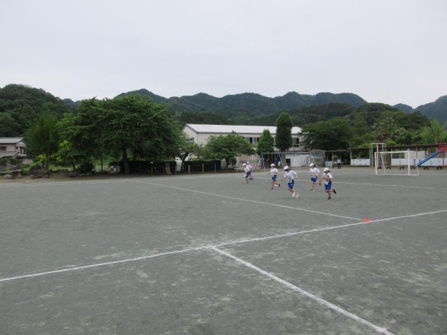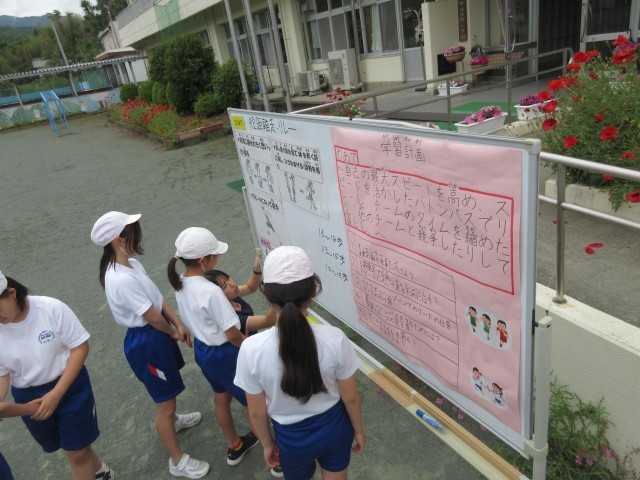 高学年は体育で短距離走、バトンパスの学習をしています。毎回今日のめあてを確認し、自分の目標をカードで確認した後に、練習を始めます。今日はしつこいくらいに「めあて」を確認していました。何のための練習なのか、何を学習していくのかを子どもたちにしっかり理解させていたので、子どもたちは声を掛け合いながら練習をしていました。