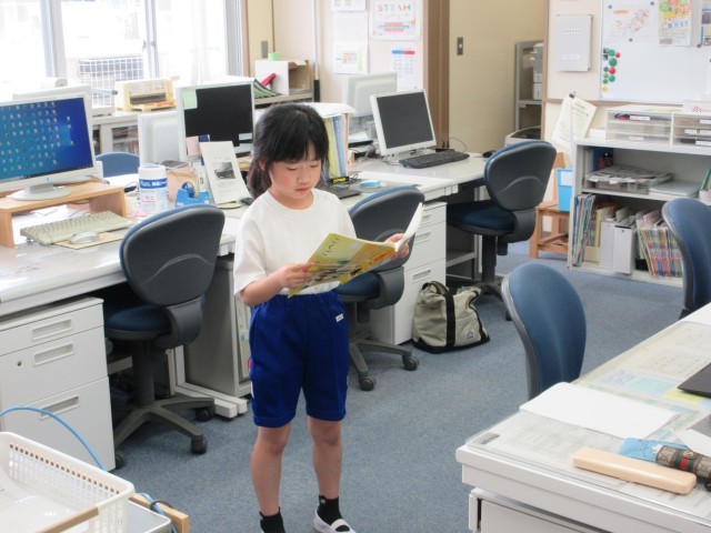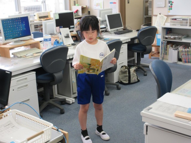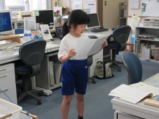 2年生が職員室に来て、「たんぽぽのちえ」の学習のまとめとして、朗読と感想文を発表してくれました。長い文章ですが、練習をたくさんしたようで、1年生の時よりずっと上手になっていました。また感想文から、タンポポが世代をつなぐための方法をよく理解して、自分なりの感想を持つことができていたことがよく分かりました。がんばりました。