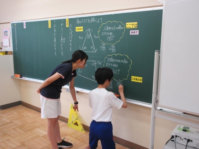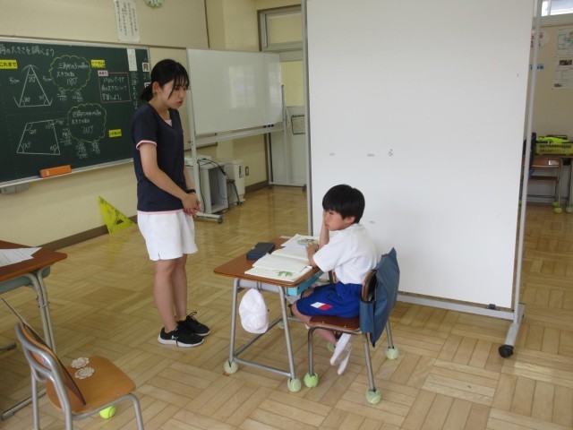 みかぼ学級では6年生が算数の学習。3年生が国語の学習に取り組んでいます。6年生は多角形の角の和の性質を利用して角度を求める問題を黒板前でやっていました。四角形の内角の和が360度であることを学んでいたので、「ハッ」と気づいたように、筆算し始め、角の大きさを求めていました。3年生は国語の学習で説明文の読み取りに取り組んでいます。
