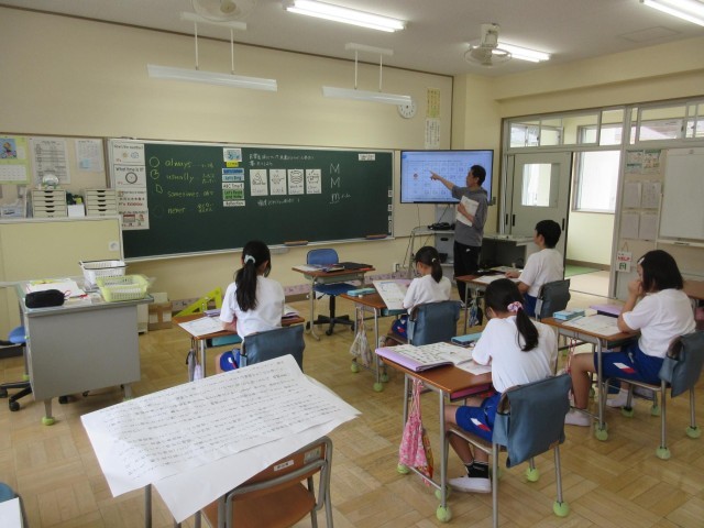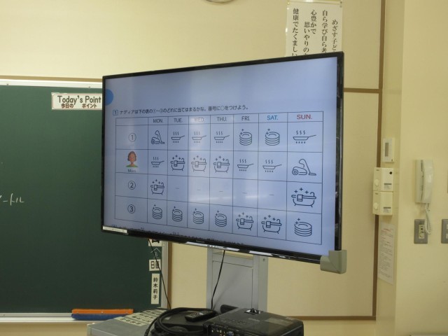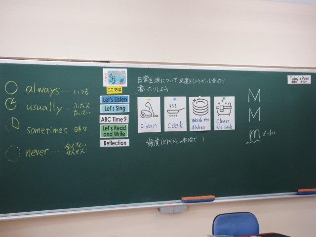 6年生は英語のワークに取り組んでいます。おとといALTの先生といっしょに学習した「スケジュール」について、「always」「usually」「sometimes」「never」など頻度に関する英語を使って、「家庭でのお手伝い」で何をどれくらいしているかを英語で表す学習をしています。リスニングもあったりと様々な方法で英語を学んでいます。