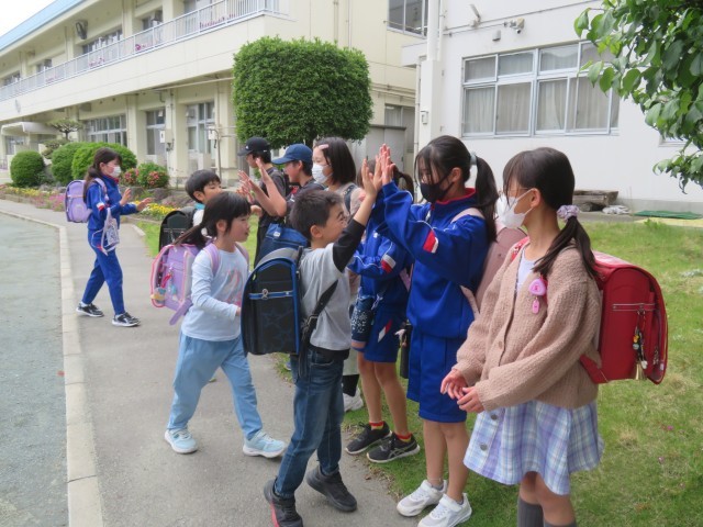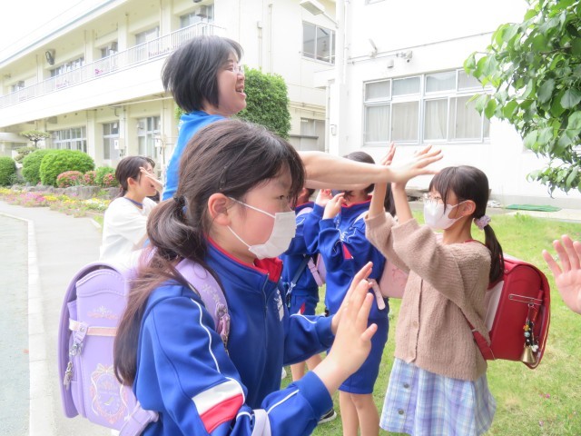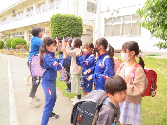 今日の放課後から毎週月曜日の下校時に、児童会の子どもたちが企画して、「スマイルハイタッチあいさつ運動」を行います。第1回目、子どもたちは笑顔で「さようなら」をハイタッチしながら交わしていました。1学期間は、月曜日の帰りに、人を代えながら実施していく予定です。