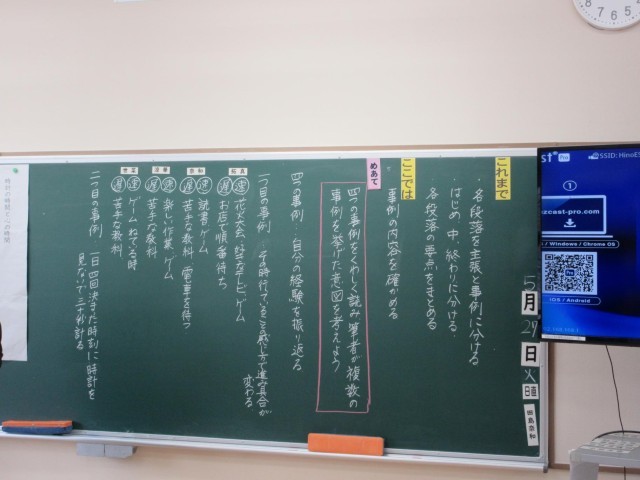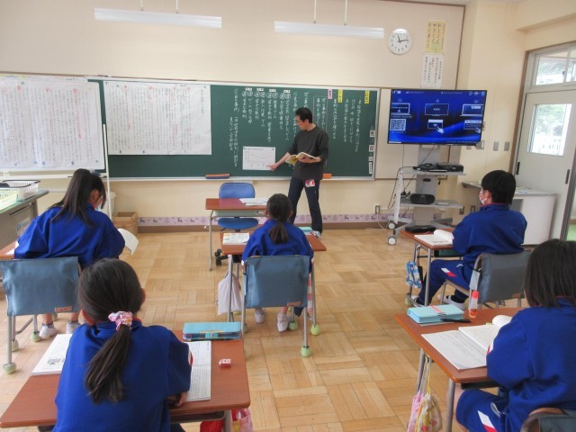 6年生は国語の学習で「時計の時間と心の時間」という説明文の読み取りの学習をしています。事例文やグラフを元にした筆者の考えを読み取りまとめる学習です。落ち着いた雰囲気の中でも先生の呼びかけに答える形で授業が進んでいます。