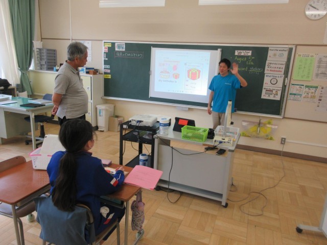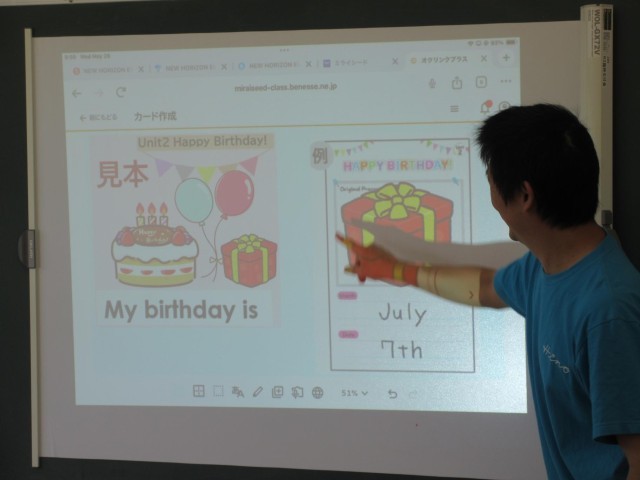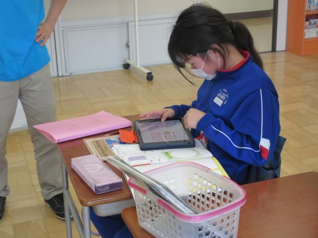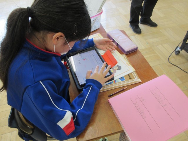 毎週水曜日は、ALTのブラント先生が英語を教えに来てくれる日です。5年生は自分の誕生日や誕生日に欲しいものを、タブレットを使ってカードに表しながらそれを英語で紹介する学習に取り組んでいます。シールがほしいことをカードにまとめるため、ワークシートをブラント先生からタブレットに送信してもらい、写真を撮ったり切り抜いたりと作業を進めながら、英語での表現を学んでいます。発表があると思うので楽しみにしています。