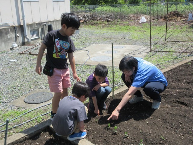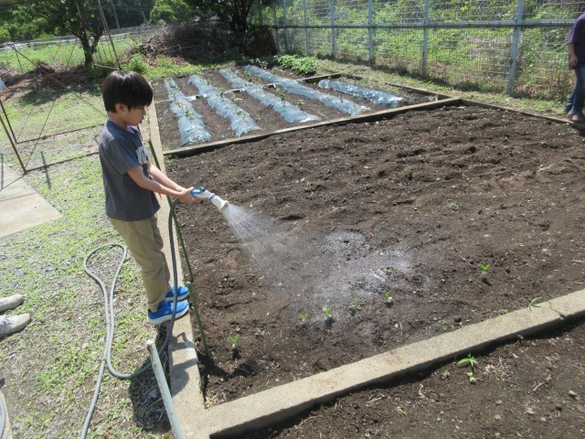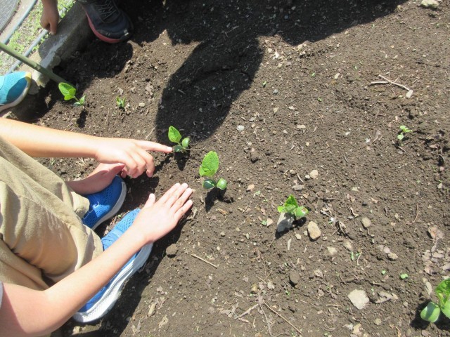 3年生は理科で、植物の生長を観察しています。自分たちで種をまいて育てている枝豆の様子を観察しに行って、「子葉」の気づいたことを話し合っています。「つるつるしているところとざらざらしているところがある」「穴が空いているけど枯れないかな」などいろいろな発見をしていました。その後は水をやったり生長記録をつけたりして学習を進めていました。